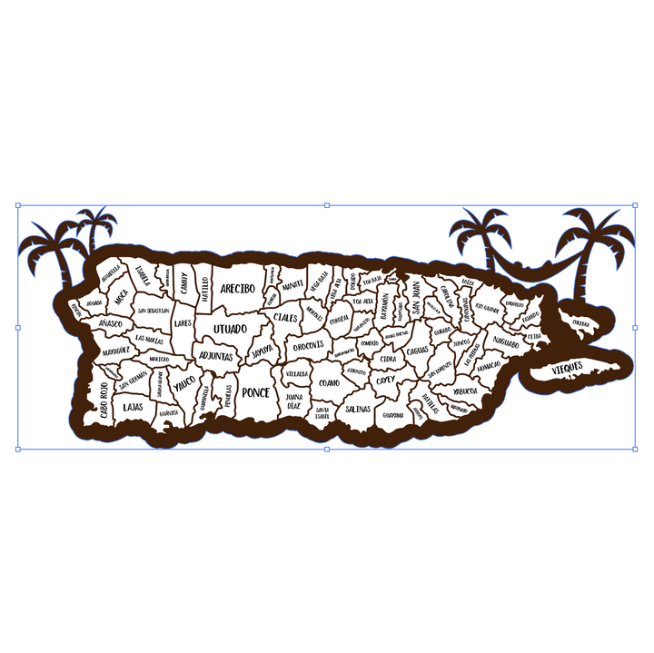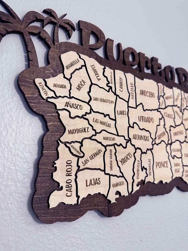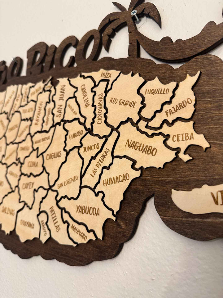 Handcrafted Puerto Rico map made of wood, size 32x12 inches. Each town is precisely laser engraved, showcasing the 78 municipalities of our beautiful island. A perfect piece to decorate your home, office, or gift to someone who loves Puerto Rico.